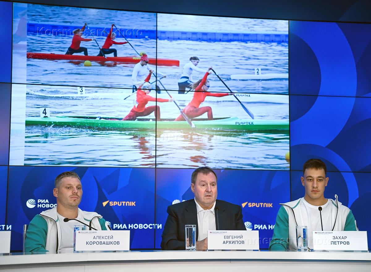 Пресс-конференция Всероссийской федерации гребли на байдарках и каноэ в МИА "Россия сегодня". Слева…