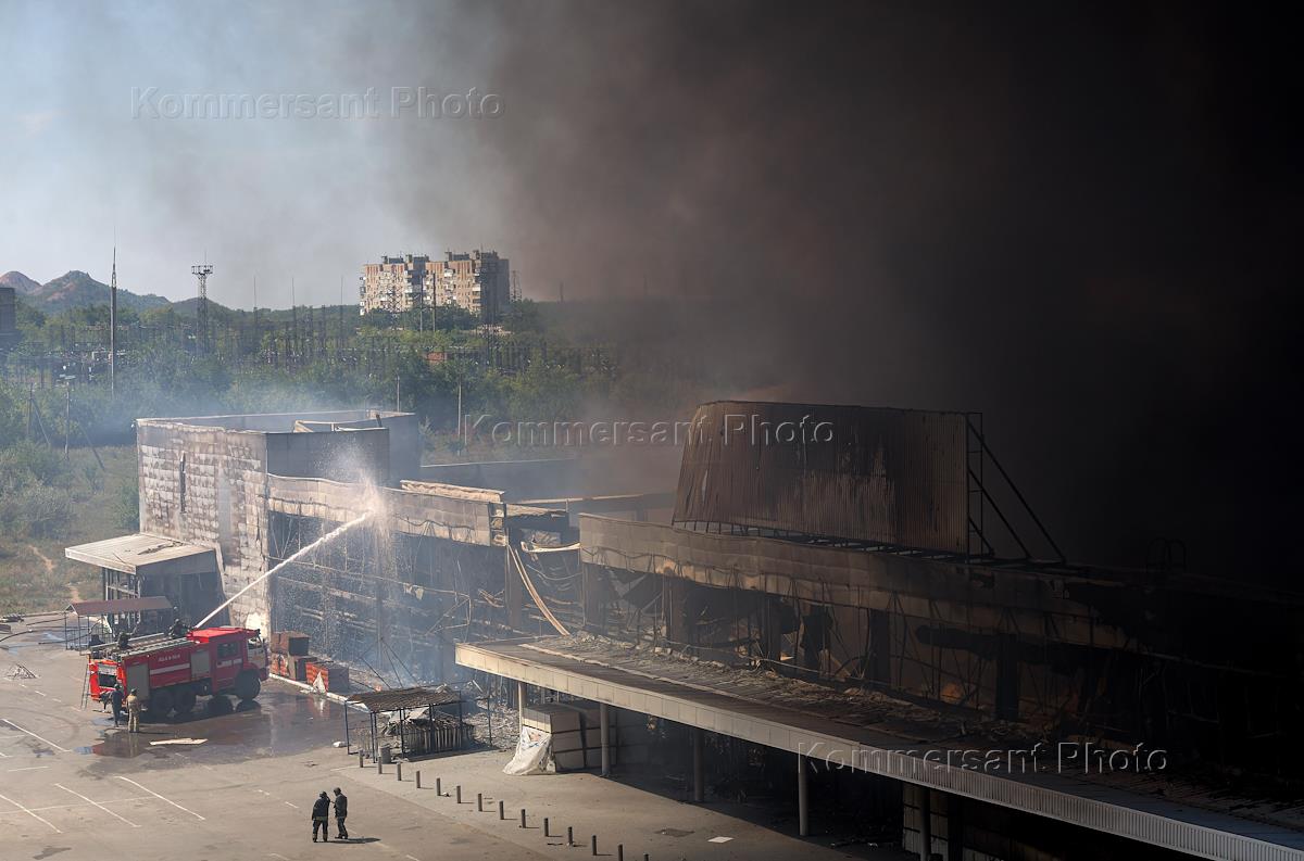 Последствия обстрела здания ТЦ "Галактика" в Петровском районе Донецка.