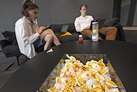 Работа офиса "Т-Банк" на Грузинском валу в бизнес-центре AFI Square. Жанровая фотография. Конфеты с…