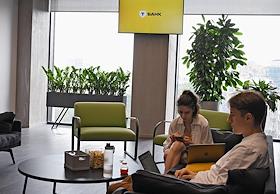 Работа офиса "Т-Банк" на Грузинском валу в бизнес-центре AFI Square. Жанровая фотография. Посетители…