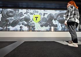 Работа офиса "Т-Банк" на Грузинском валу в бизнес-центре AFI Square. Жанровая фотография. Холл в…