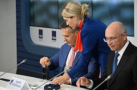 Экономика и бизнес Торжественная церемония гашения почтового блока с маркой и конвертом к 120-летию информационного агентства России ТАСС в пресс-центре ТАСС.
