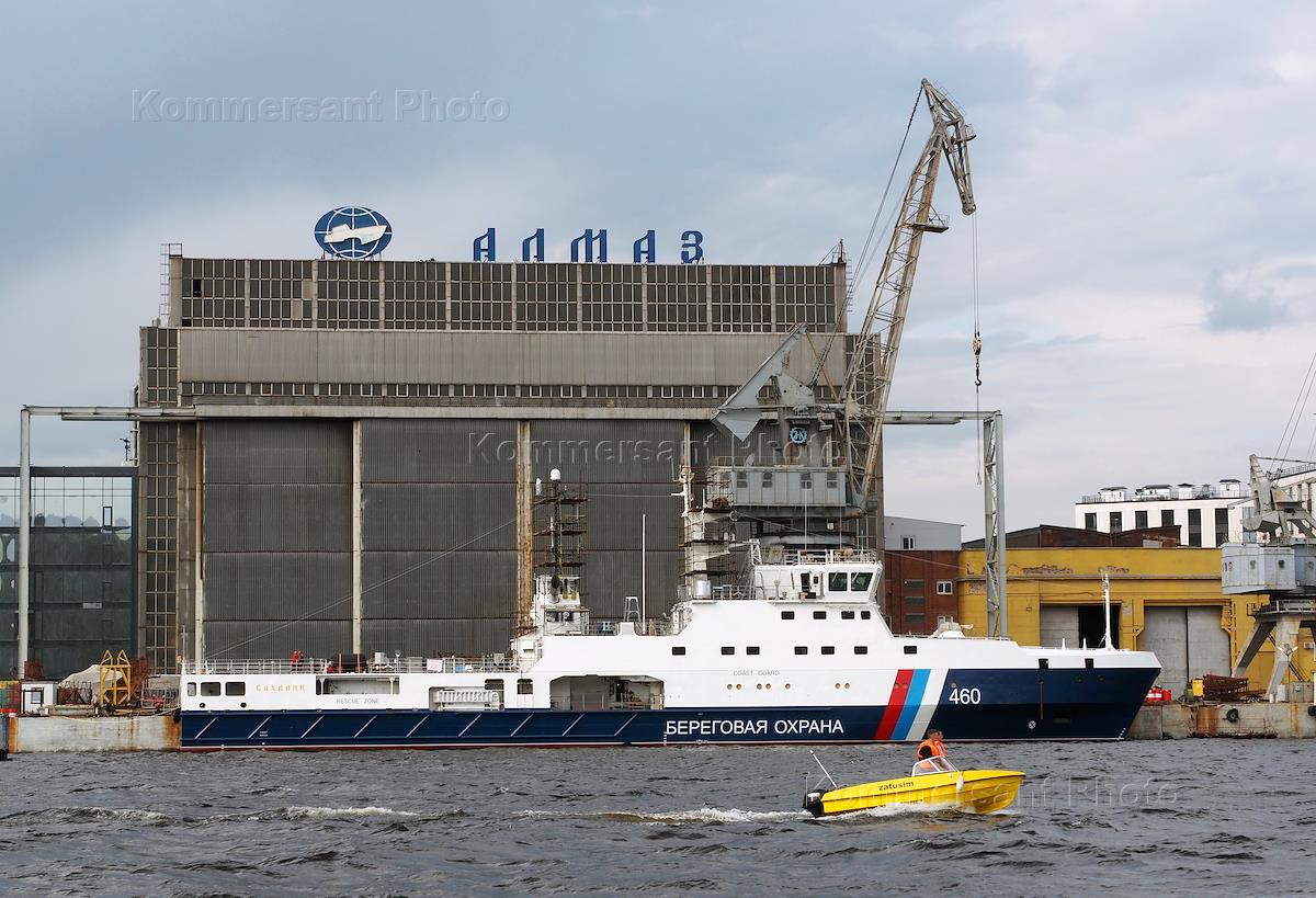 Судостроительная фирма "Алмаз" на реке Малая Нева. Катер береговой охраны в акватории реки.