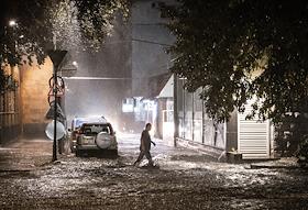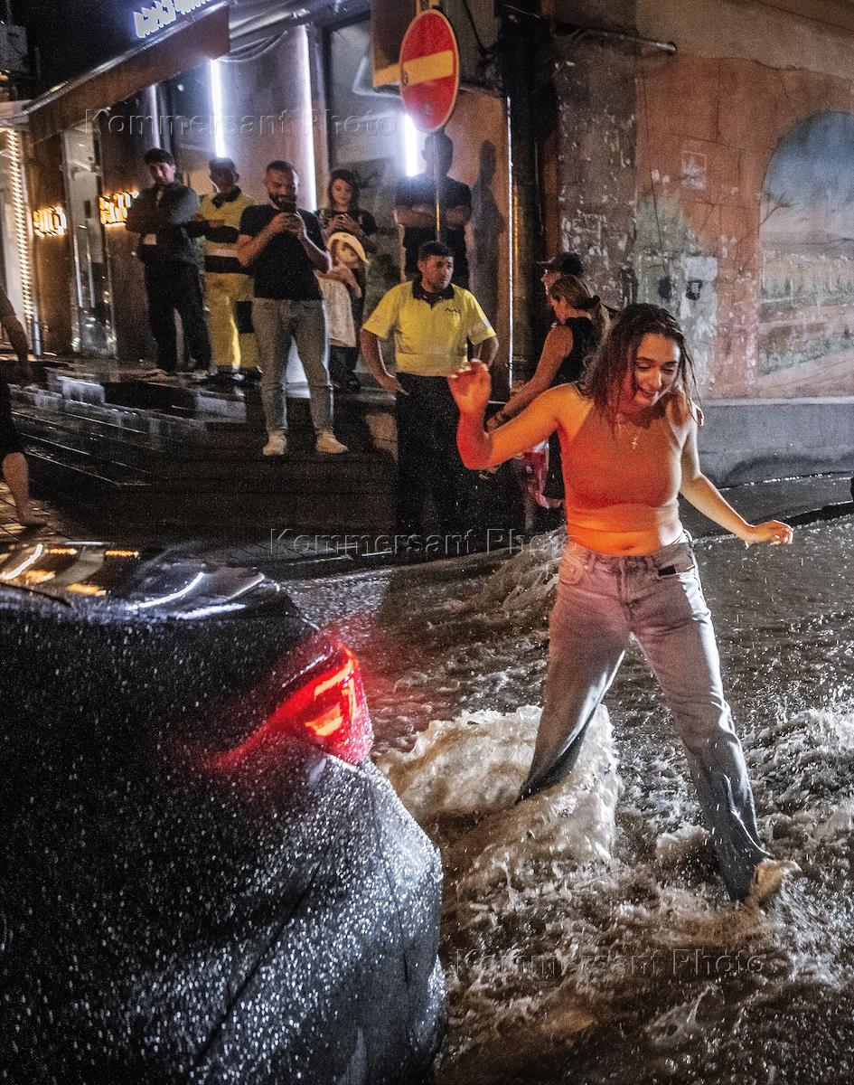 Виды вечернего Еревана во время грозы. Жанровая фотография. Затопленная улица города во время ливня.