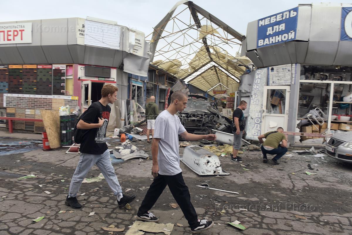 Последствия обстрела рынка "Сокол" в Донецке. Разрушенные павильоны рынка.