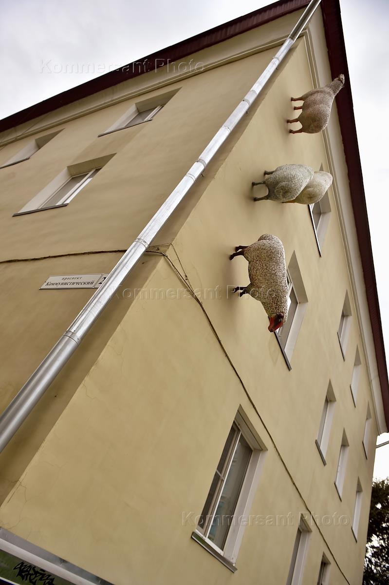 Виды Горно-Алтайска. Жанровая фотография. Фигуры овец, "гуляющих" по фасаду жилого дома на…