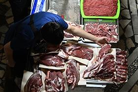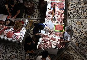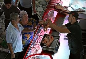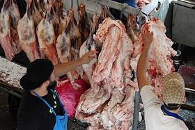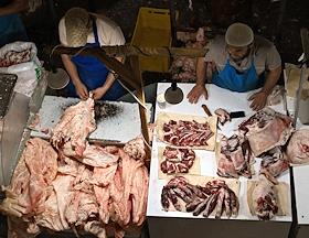 Жанровая фотография. Городской рынок. Торговля мясом на рынке.