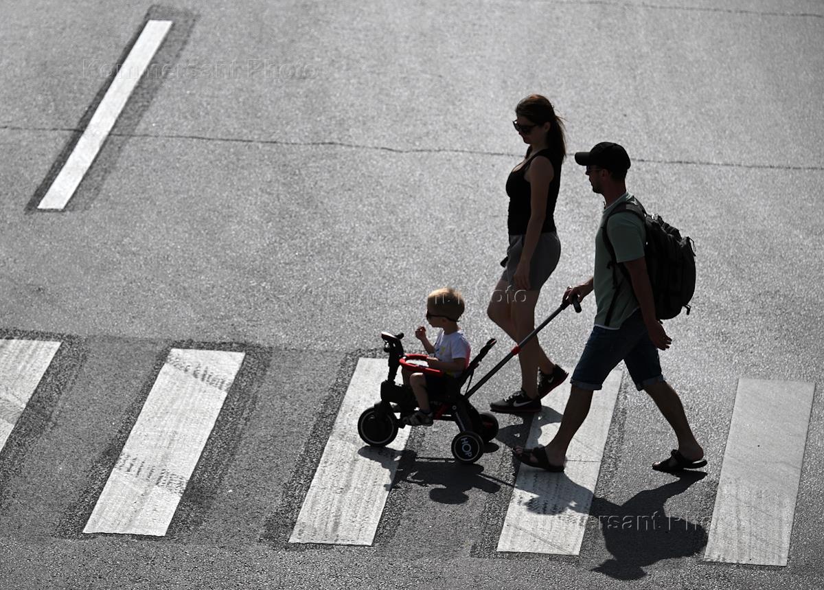 Жанровая фотография. Мужчина и женщина с ребенком идут по пешеходному переходу.
