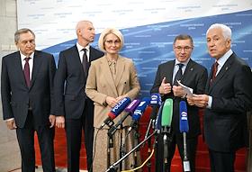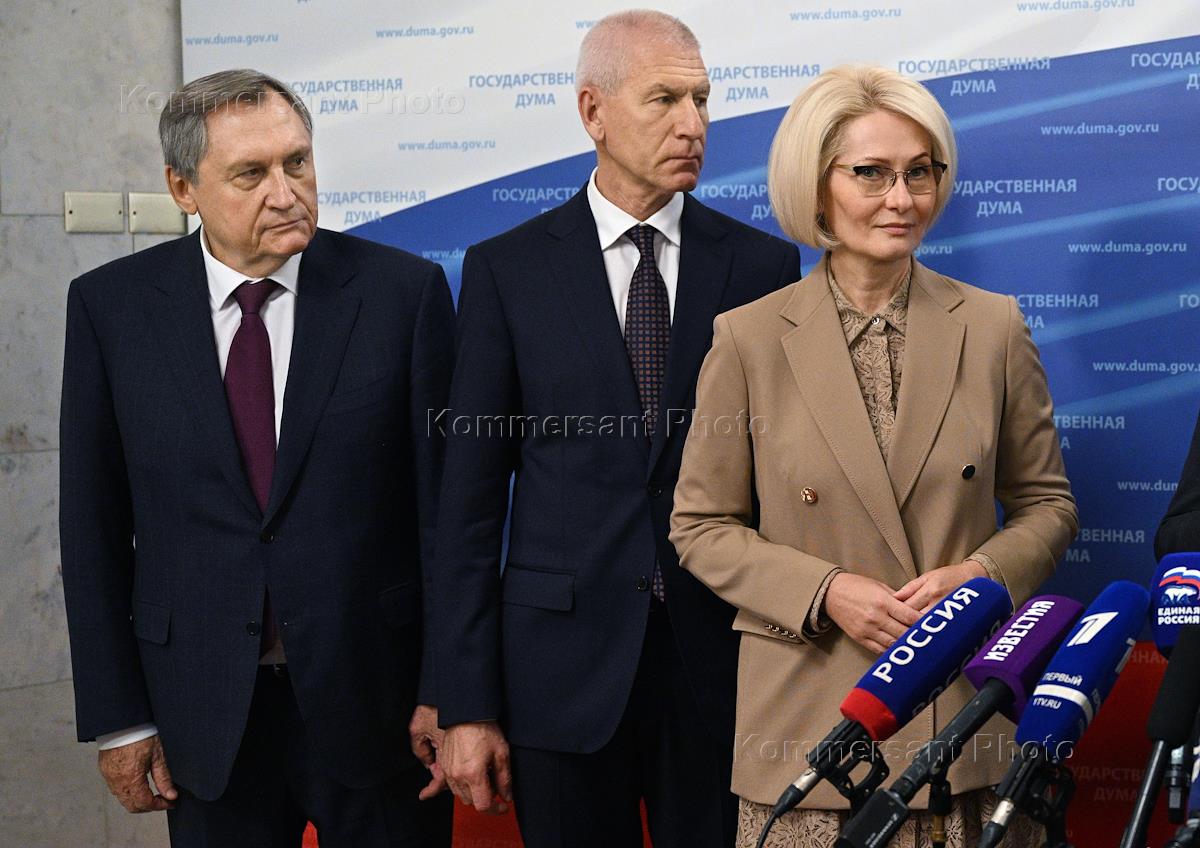 Политика Пресс-подход по итогам собрания фракции "Единая Россия" с участием руководителя фракции "Единая Россия" в Государственной думе (ГД) России Владимира Васильева, вновь избранных депутатов - бывшего заместителя председателя правительства России Виктории Абрамченко, бывшего министра энергетики России Николая Шульгинова, бывшего министра спорта России Олега Матыцина в ГД России.