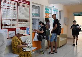 Работа городской поликлиники. Пациенты в очереди в регистратуру поликлиники.