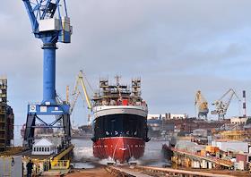 Экономика и бизнес Торжественная церемония спуска на воду большого морозильного рыболовного траулера "Капитан Юнак", пятого судна в серии, строящейся для "Русской Рыбопромышленной Компании" на судостроительном заводе "Адмиралтейские верфи".