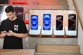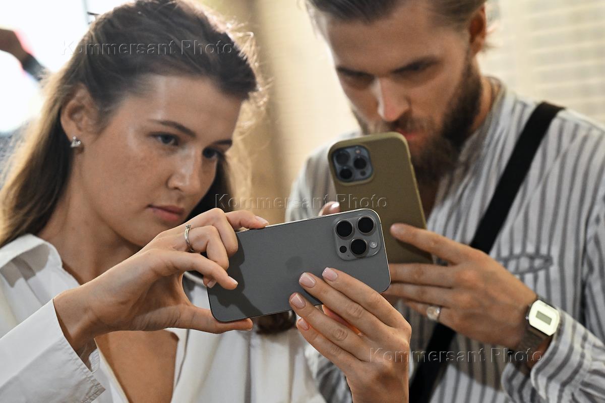 Презентация Iphone 16 во флагманском магазине МТС на улице Тверская. Посетители магазина во время…