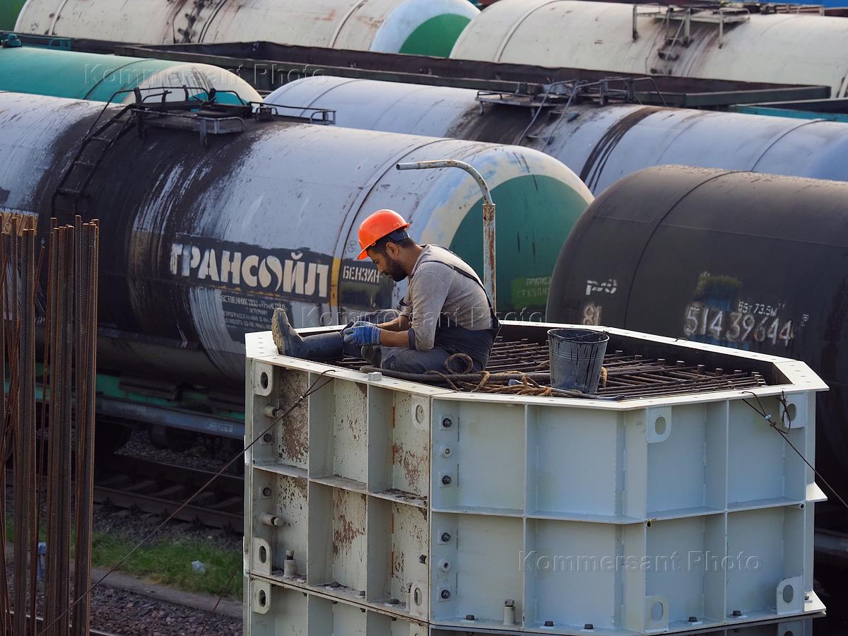 Виды Санкт-Петербурга. Жанровая фотография. Рабочий в каске на фоне грузовых составов на…