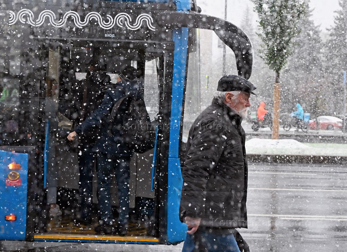 Снегопад в Москве. Жанровая фотография. Люди возле остановки электробуса во время снегопада.