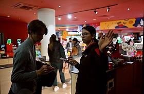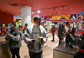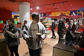 Жанровая фотография. Зрители перед началом сеанса в холле кинотеатра "КАРО SKY 17 Авиапарк".