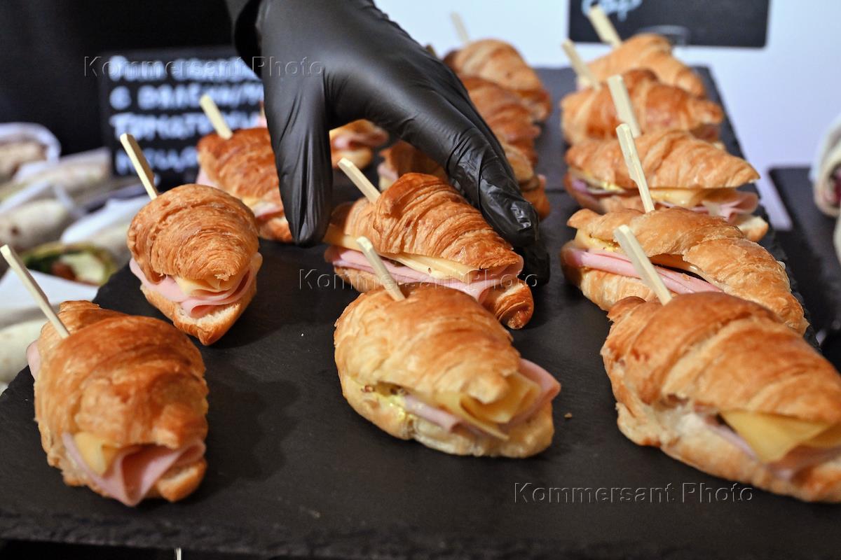Жанровая фотография. Круассаны с сыром и ветчиной на подносе.