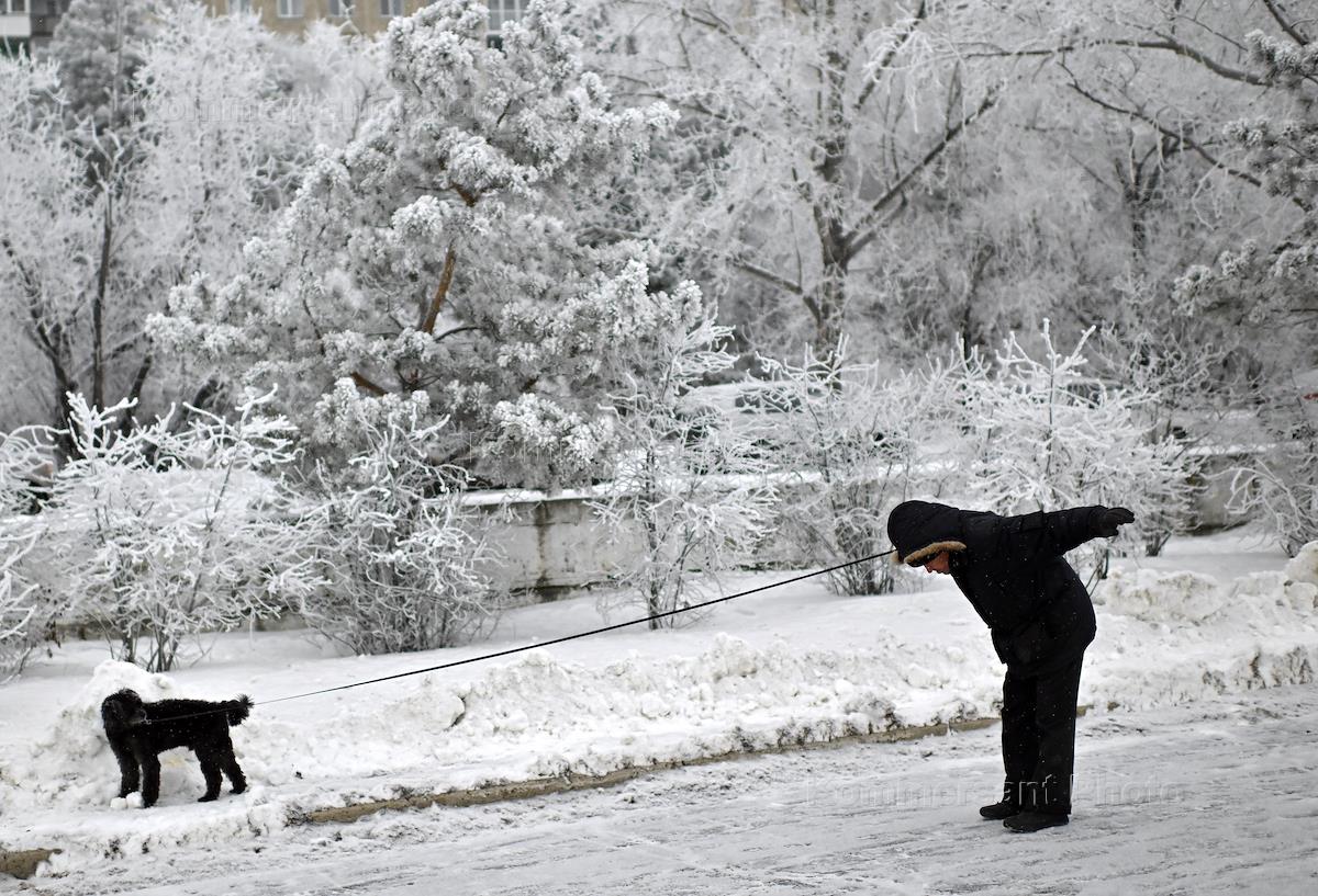 Жанровая фотография. Мужчина выгуливает собаку во время снегопада.