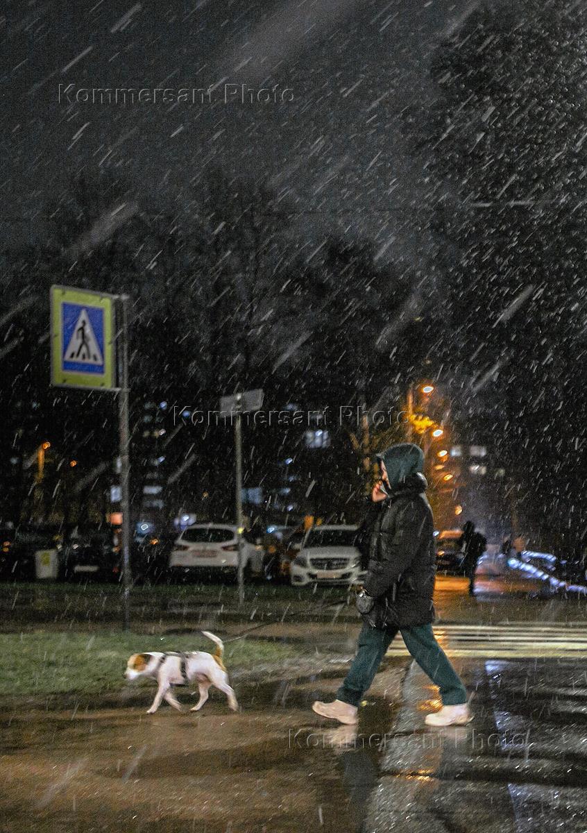 Жанровая фотография. Мокрый снег и пешеходы на улице во время снегопада. Девушка идет по улице с…