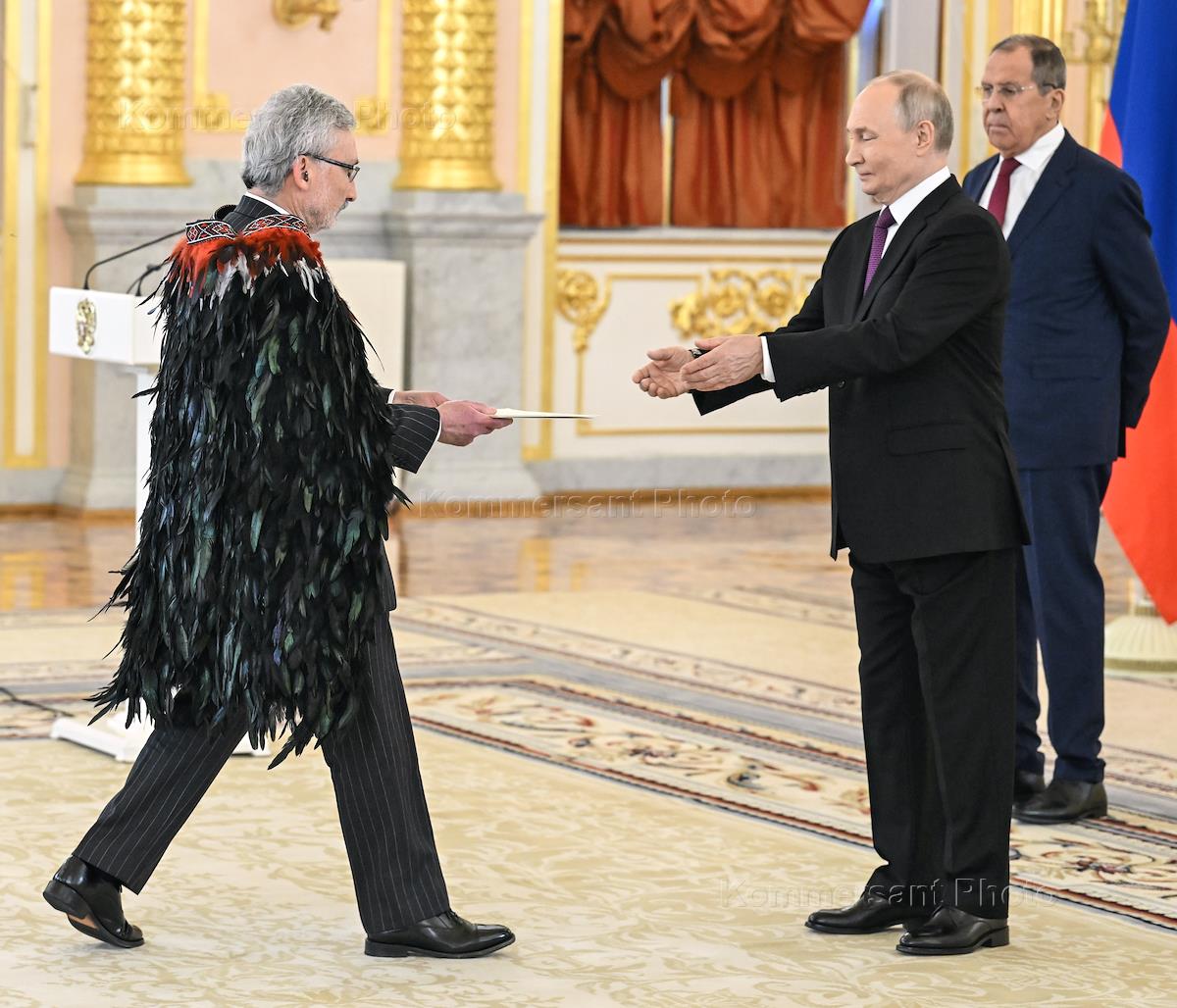 Politics The ceremony of presenting credentials by newly arrived ambassadors of foreign states to Russian President Vladimir Putin in the Alexander Hall of the Grand Kremlin Palace.