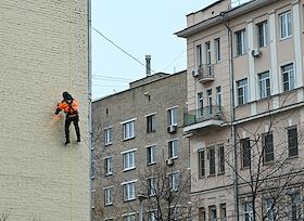 Виды Москвы. Жанровая фотография. Рабочий во время ремонта фасада здания.