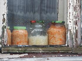 Виды поселка Ульяновка. Жанровая фотография. Банки с квашенной капустой на подоконнике.