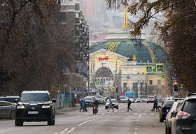 Виды Красноярска. Жанровая фотография. Пешеходы переходят проезжую часть дороги на проспекте Мира.