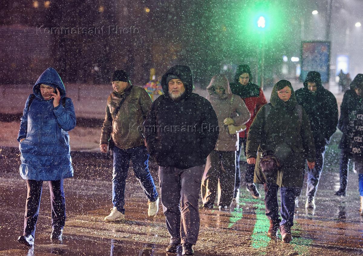 Виды Казани во время снегопада. Жанровая фотография. Пешеходы во время перехода проезжей части…