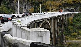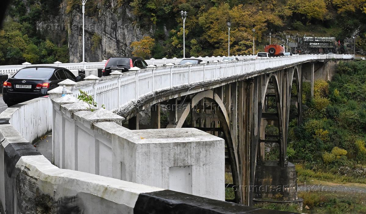 Ситуация в Абхазии. Жанровая фотография. Движение автомобилей по мосту через реку.