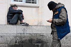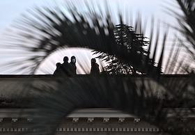 Ситуация в Абхазии. Виды Сухума. Мужчина и женщина на набережной кормят чаек.