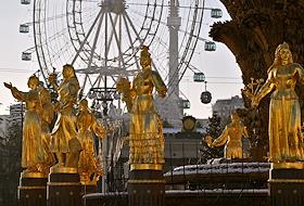 Виды Москвы. ВДНХ. Скульптуры фонтана "Дружба народов" на фоне колеса обозрения "Солнце Москвы".