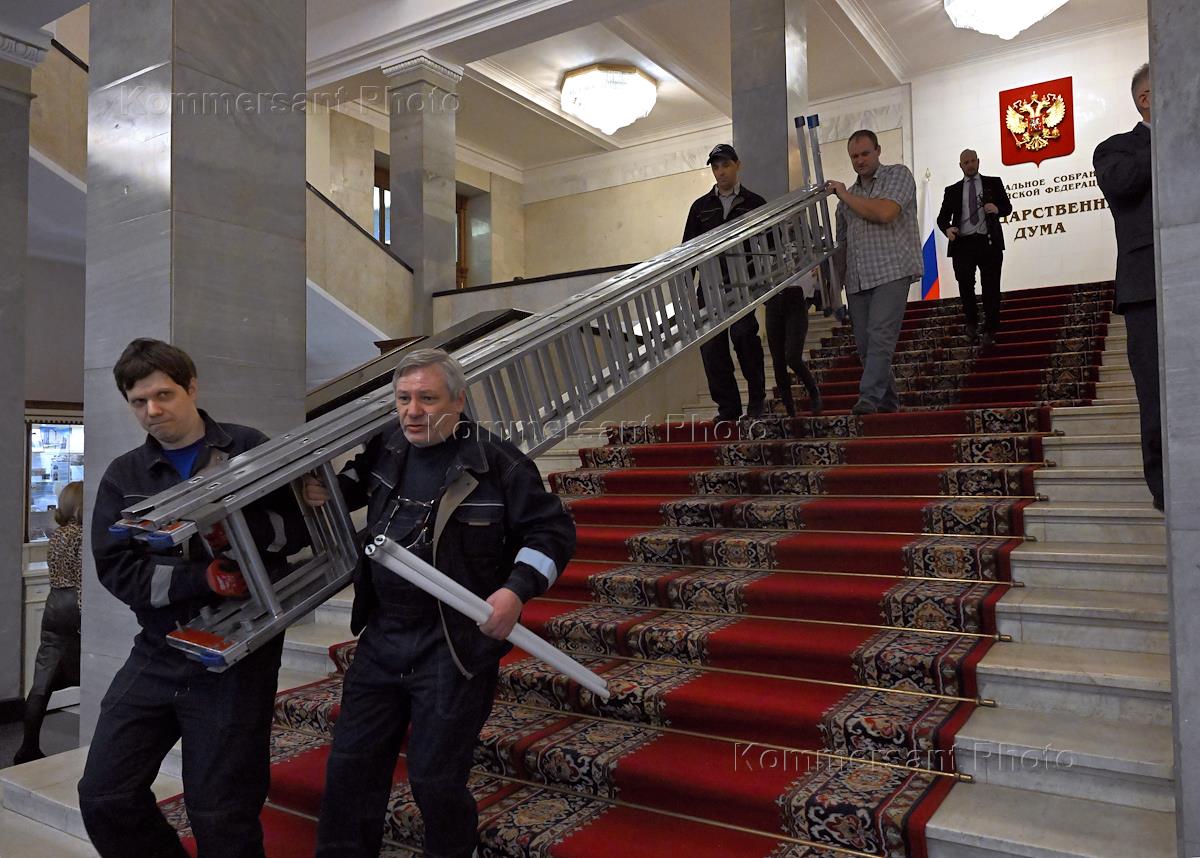 Пленарное заседание Государственной думы (ГД) России. Жанровая фотография. Сотрудники хозяйственной…