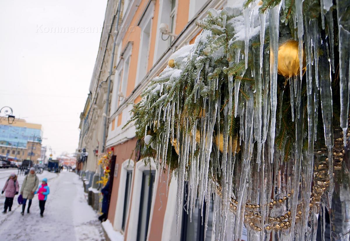 Виды Нижнего Новгорода. Жанровая фотография. Сосульки на новогоднем украшении фасада здания.
