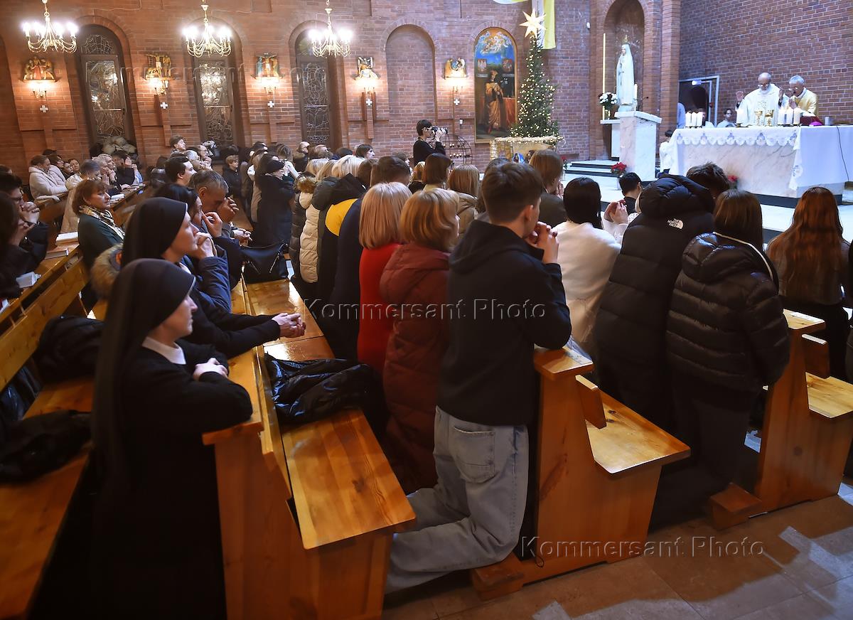 Рождественская месса в Католическом кафедральном соборе Преображения Господня. Верующие во время…