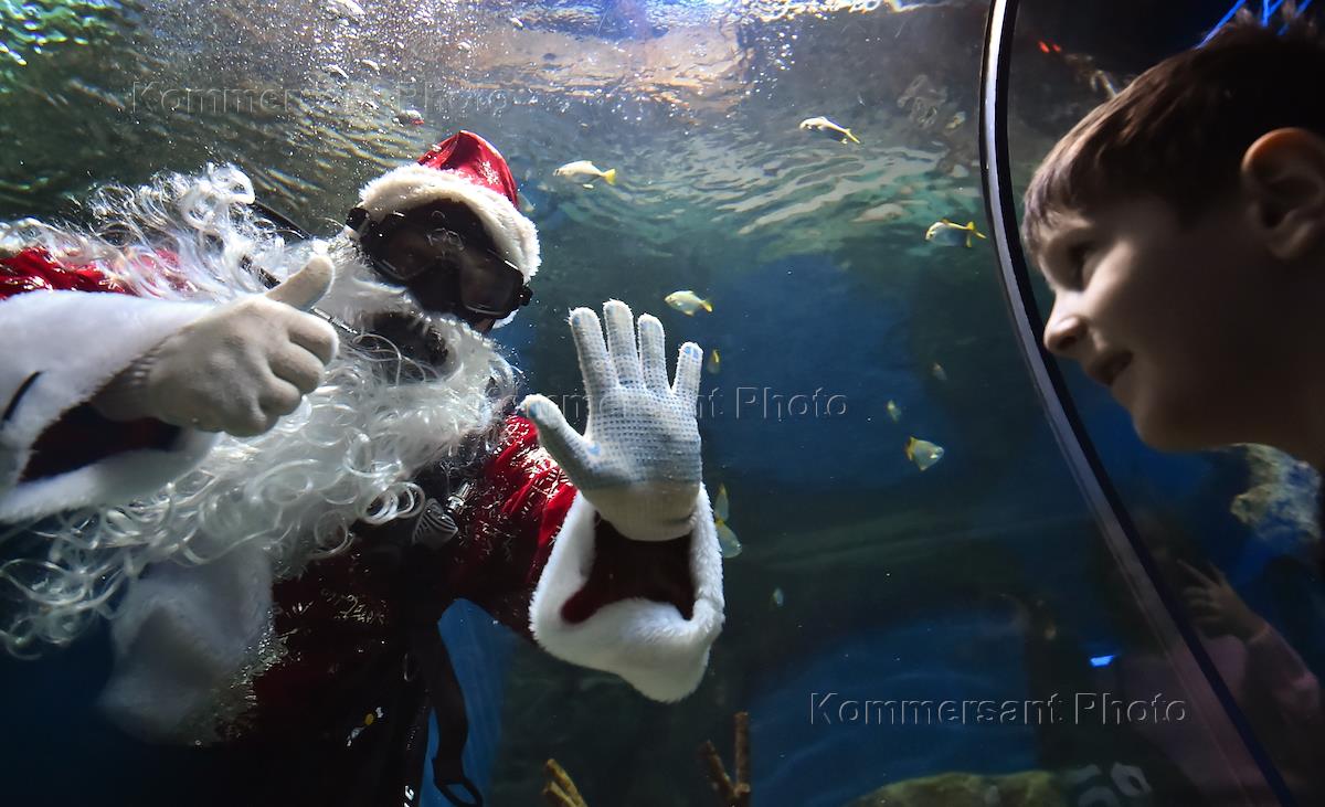 Дайвер в костюме Деда Мороза в аквариуме Центра океанографии и морской биологии «Дельфиния» в Новосибирске.