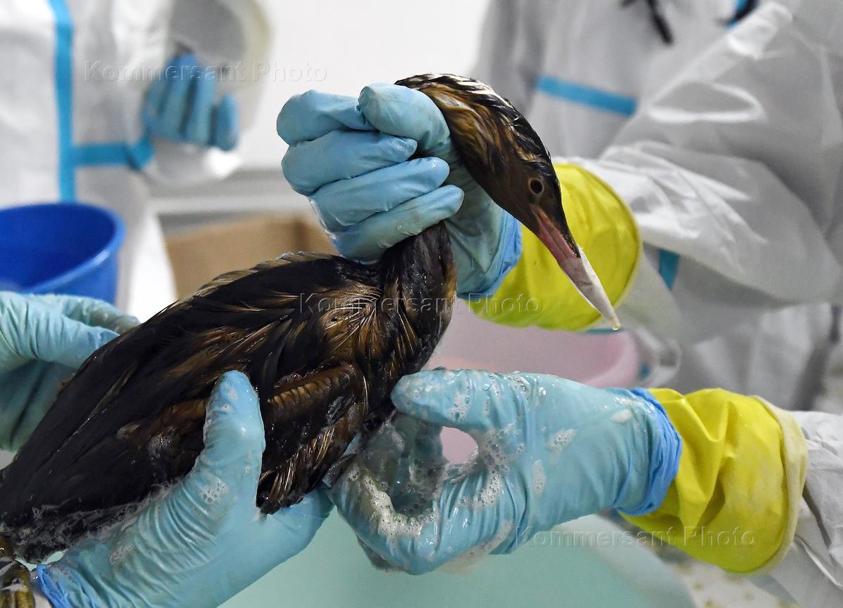 Волонтёры в Алуште отмывают птиц, пострадавших от разлива мазута в Чёрном море.