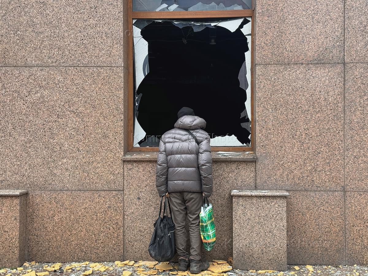 Последствия обстрела ракетами HIMARS Киевского района Донецка. Разбитое окно офисного здания после…
