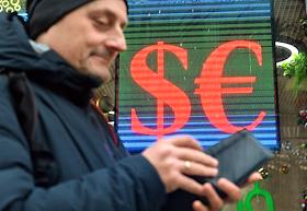 Виды Москвы. Жанровая фотография. Мужчина с кошельком на фоне светового табло пункта обмена валют.