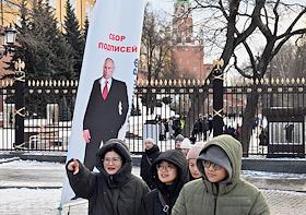 Виды Москвы. Манежная площадь. Жанровая фотография. Иностранные туристы на фоне флага с портретом…