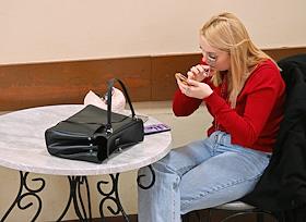 Кафе. Жанровая фотография. Девушка наносит макияж.