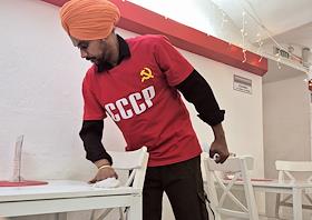 Чебуречная "СССР". Жанровая фотография. Сотрудник кафе протирает столк.