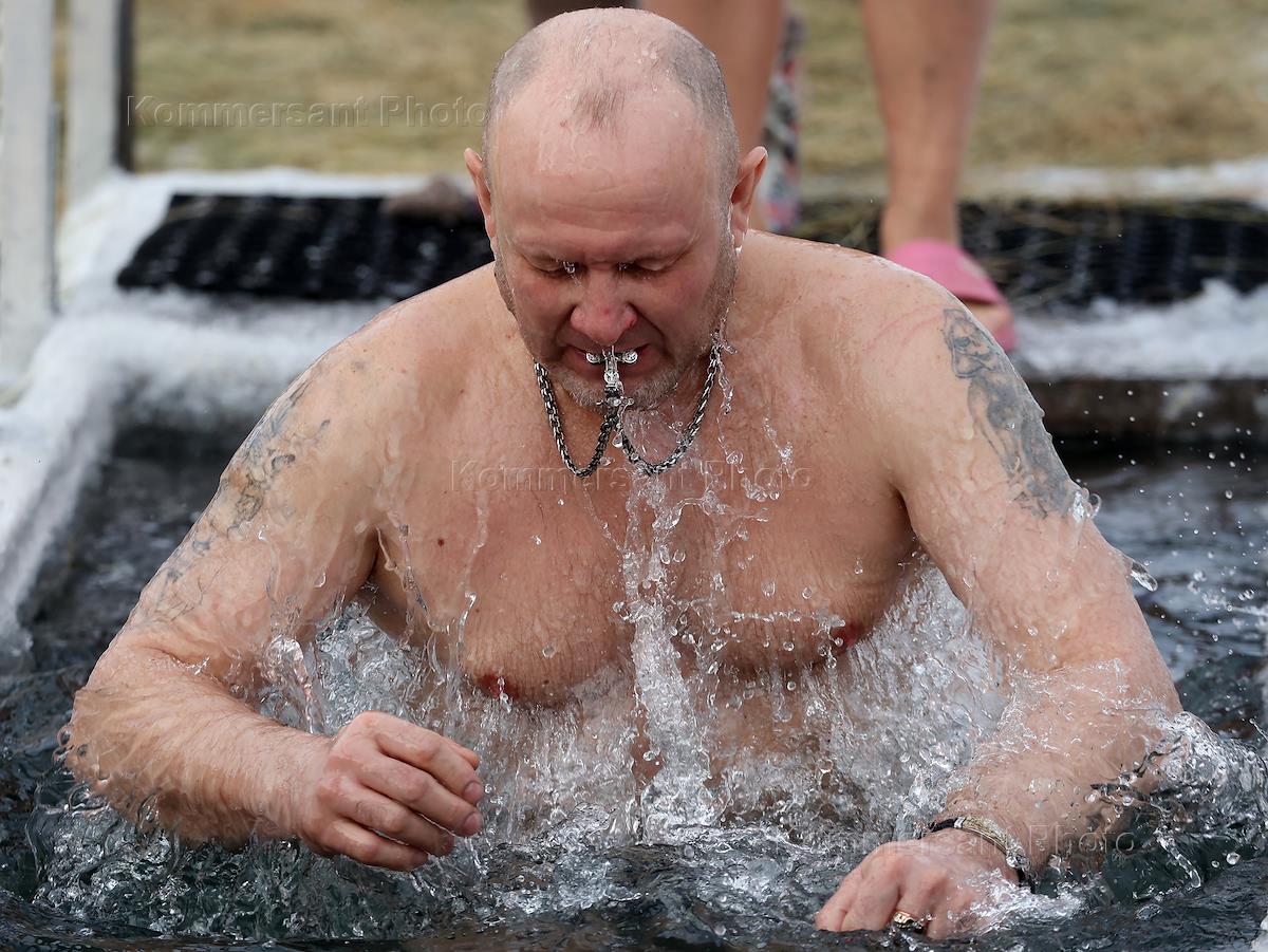 Праздник Крещения Господня. Крещенские купания на реке Обь. Священнослужитель во время чина Великого…