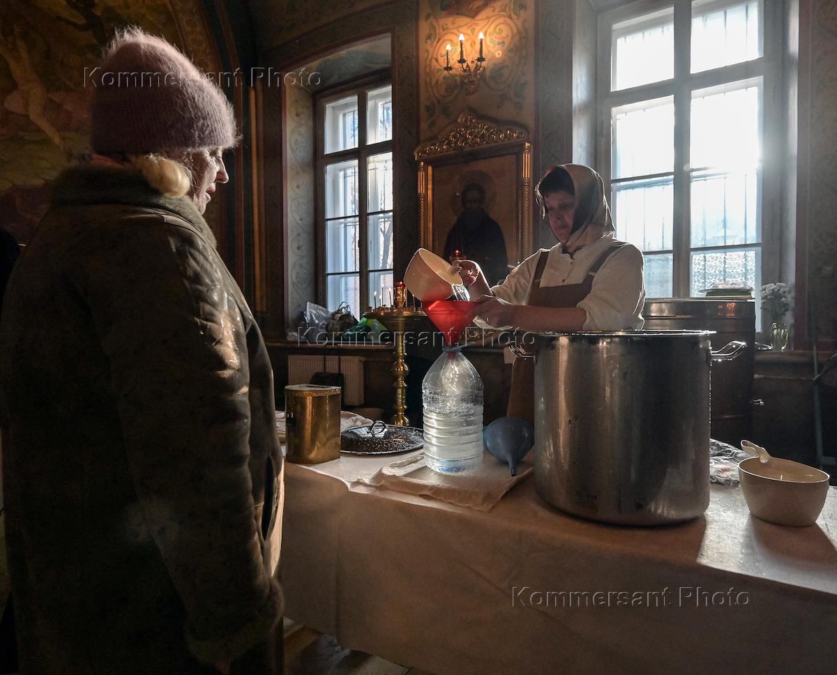 Праздник Крещения Господня. Освящение воды и раздача ее прихожанам в храме Флора и Лавра на Зацепе.