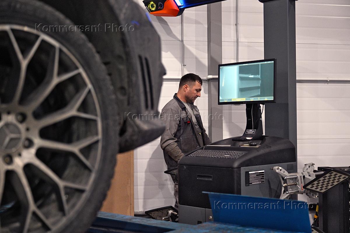Работа автосервиса компании "999 Партс" (999 parts). Жанровая фотография. Сотрудник автосервиса на…
