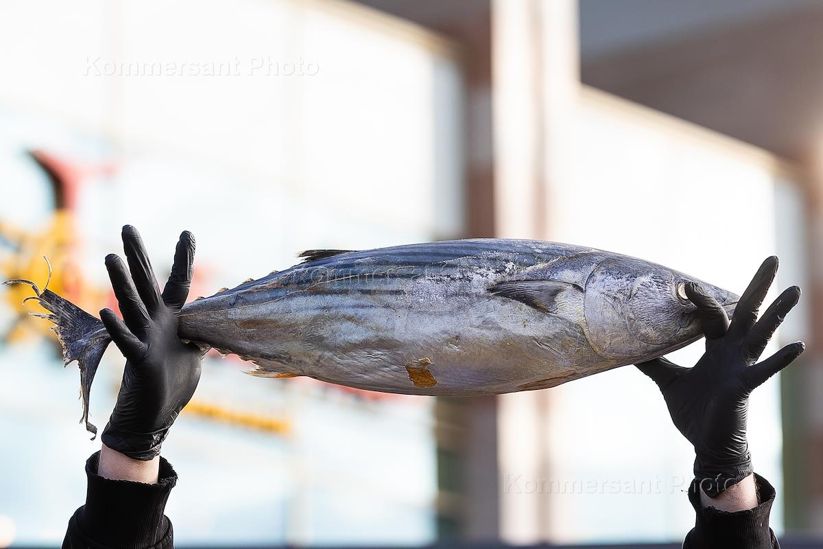 Установление рекорда России по приготовлению самой большой порции строганины из пеламиды весом 98 килограмм на площади Победы в Калининграде.