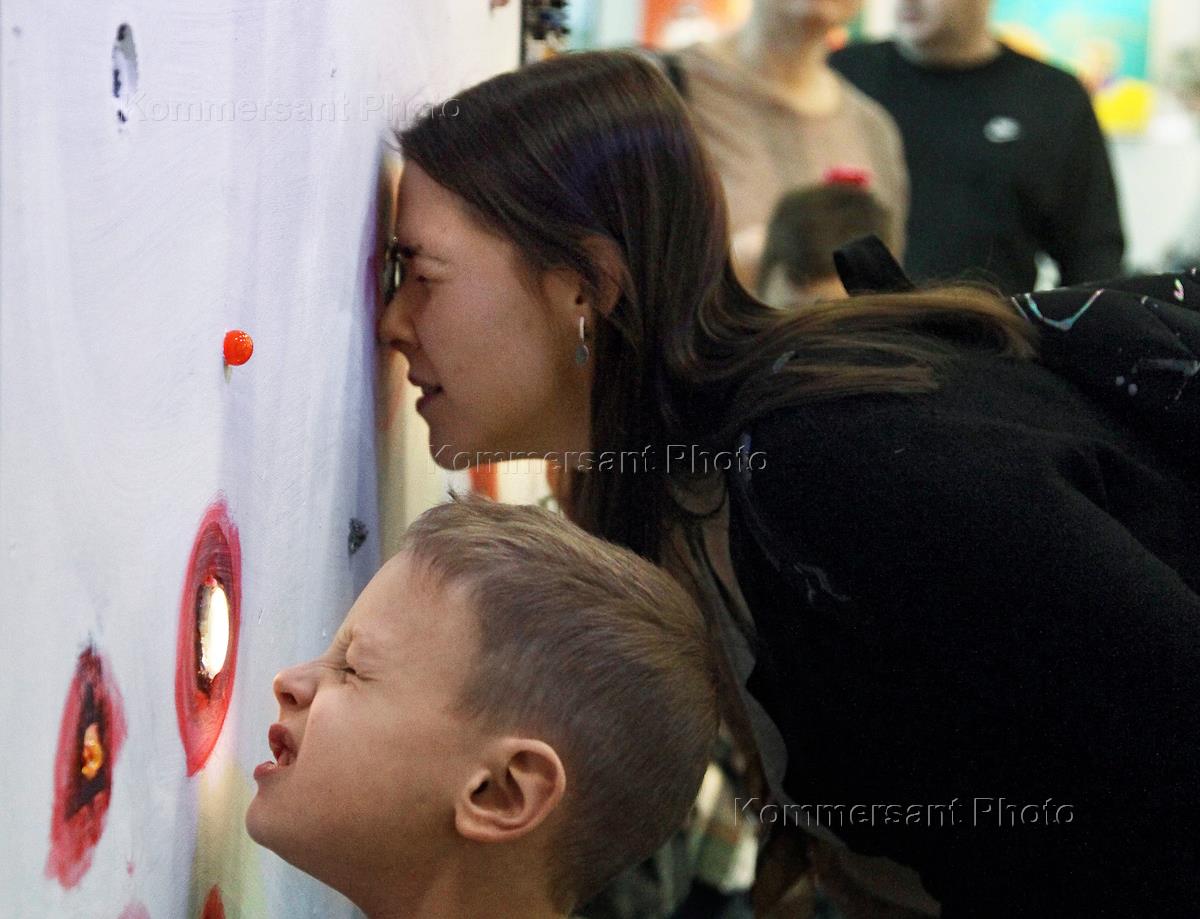 Международная выставка искусств "Арт-мир". Посетители смотрят внутрь инсталляции "Кибер изба".