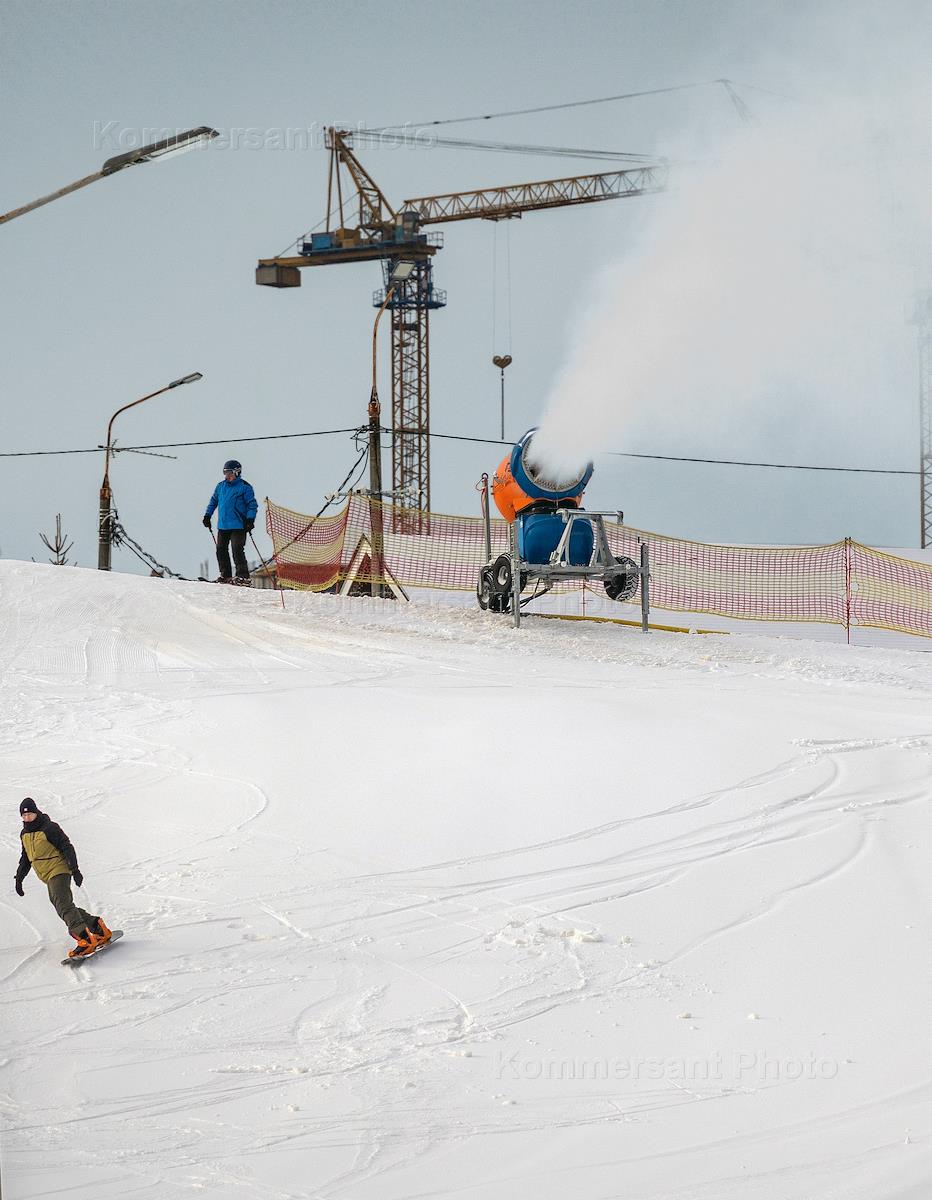 Жанровые фотографии. Создание искусственного снежного покрова на склоне для лыж в Подольске.