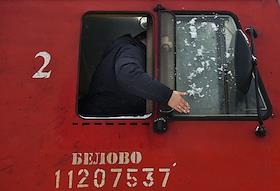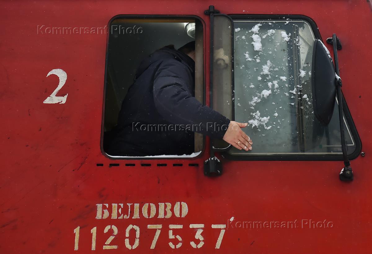 Жанровая фотография. Съемки фильма "Только путь". Машинист в кабине электропоезда.
