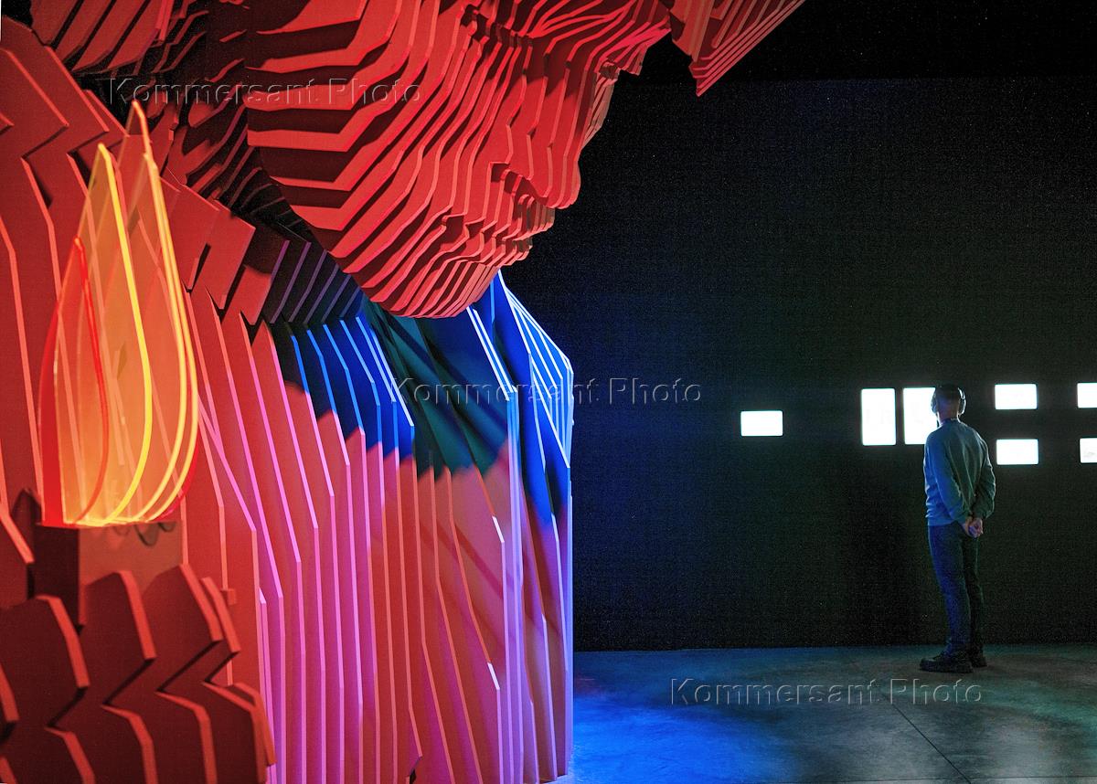 Выставка-байопик "Виктор Цой. Легенда" в пространстве "Севкабель Порт". Посетители на выставке.