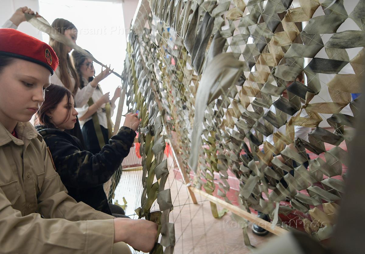 Жанровая фотография. Волонтеры плетут маскировочную сеть для Вооруженных Сил России в Харцызске.