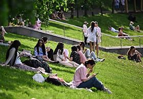 Жанровая фотография. Молодые люди сидят на газоне в парке.